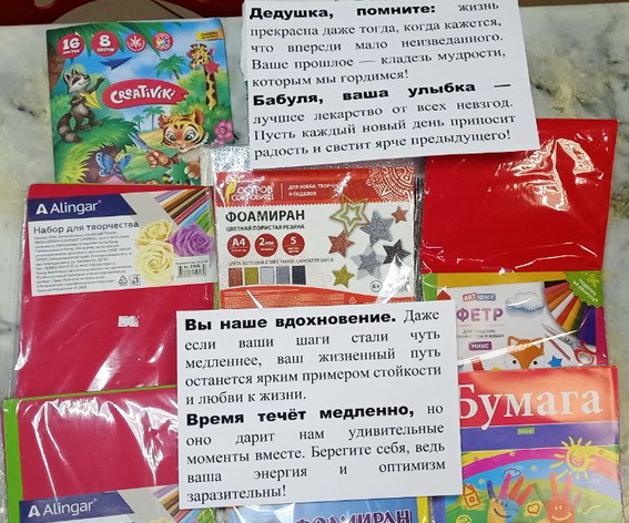 С любовью и заботой от первичного отделения Движения Первых Крымского медицинского колледжа https://vk.com/medicol82 куратор ПО Анна Васильевна Бакунова привезла особенный подарок ко Дню пожилого человека. Это целая палитра ярких материалов для творчества: цветная бумага, формиан и мягкий фетр. Пусть эти материалы станут источником вдохновения и подарят много радостных моментов нашим дорогим старшим!